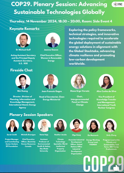 BAKU, AZERBAIJAN—In a powerful display of global cooperation, the side event “Advancing Sustainable Technologies Globally” at COP29 brought together a diverse group of experts to address the urgent need for accelerated climate action. Co-organized by the International Youth Nuclear Congress in collaboration with Women in Renewable Energy (WiRE) and Women in Nuclear, the event served as a "rallying cry for collective action," highlighting a shared understanding that no single technology or sector can solve the climate crisis alone.