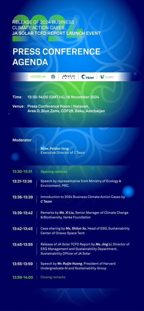 BAKU, AZERBAIJAN – At the 2024 United Nations Climate Change Conference (COP29), JA Solar, a leader in the renewable energy sector, officially launched its first-ever Task Force on Climate-Related Financial Disclosures (TCFD) Report. The November 18 press conference, held in the Natavan conference room in Area D of the Blue Zone, underscored the company's proactive approach to integrating climate considerations into its core business strategy and financial planning.